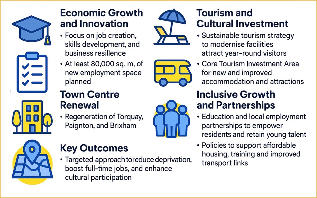 4.5 Torbay's Community and Corporate Plan prioritises inclusive economic growth, aiming to create opportunities for all residents. This section supports that ambition by focusing on job creation, skills development, and business resilience. The emphasis on high-tech industries and education partnerships reflects a commitment to long-term prosperity and social mobility. Investment in employment land and infrastructure is key to unlocking Torbay's potential and reducing deprivation.