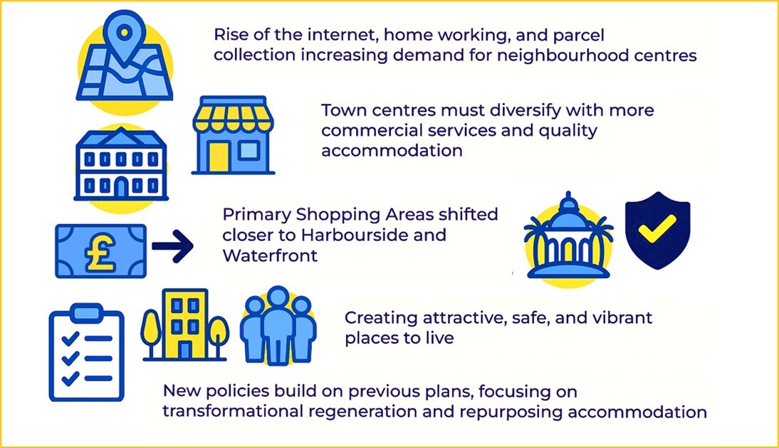 The Local Plan will support measures to make town centres, harbourside and waterfront safe and welcoming for all. In principle, development that helps create a vibrant, diverse daytime, evening and nighttime economy or would contribute positively to environmental improvements, lighting and safety measures within the town centres, seafront and harbour areas of the Bay will be supported.